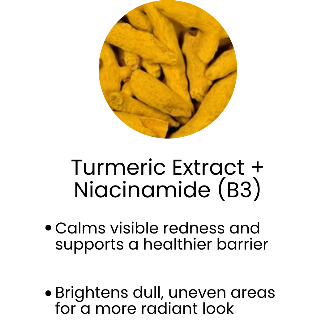 Kojic Acid, Niacinamide & Turmeric support a more even-looking complexion.